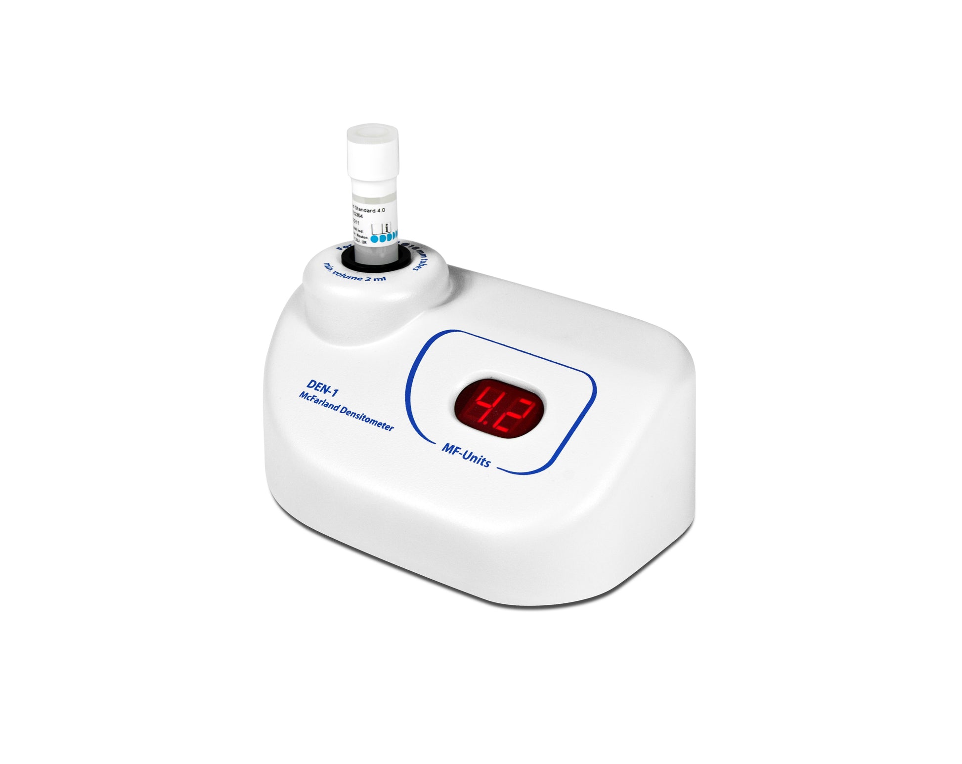 The densitometers are designed, and factory calibrated to measure turbidity in the range of McFarland units. For DEN-1 and DEN-1B it is 0.00 to >15.00 McFarland units with a small standard deviation.