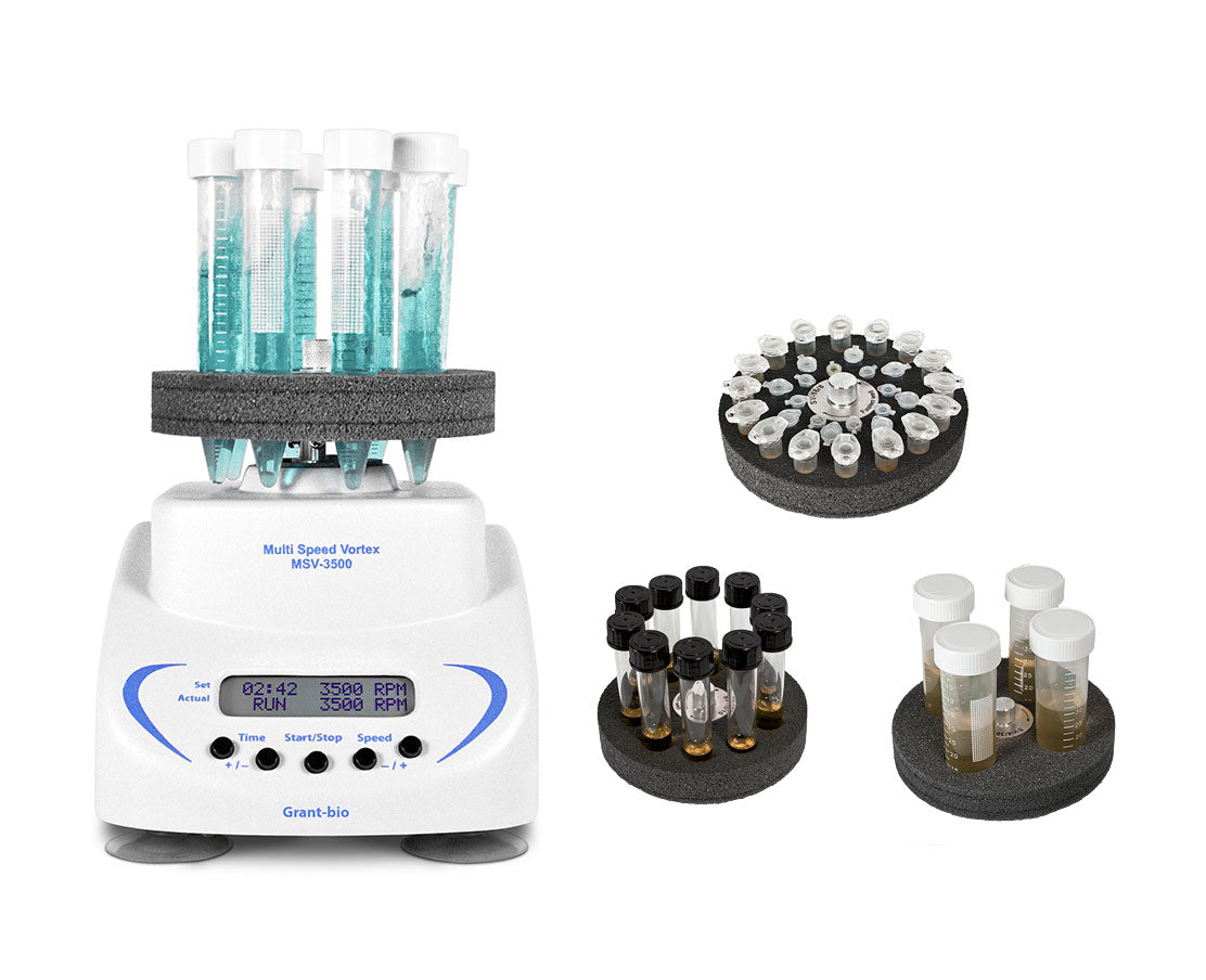 The Grant bio MSV-3500 is a versatile multi speed vortex mixer designed for soft or intensive mixing of reagents in different size and type plastic tubes (0.2 to 50ml).